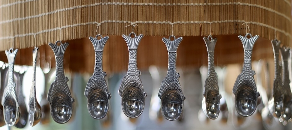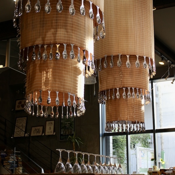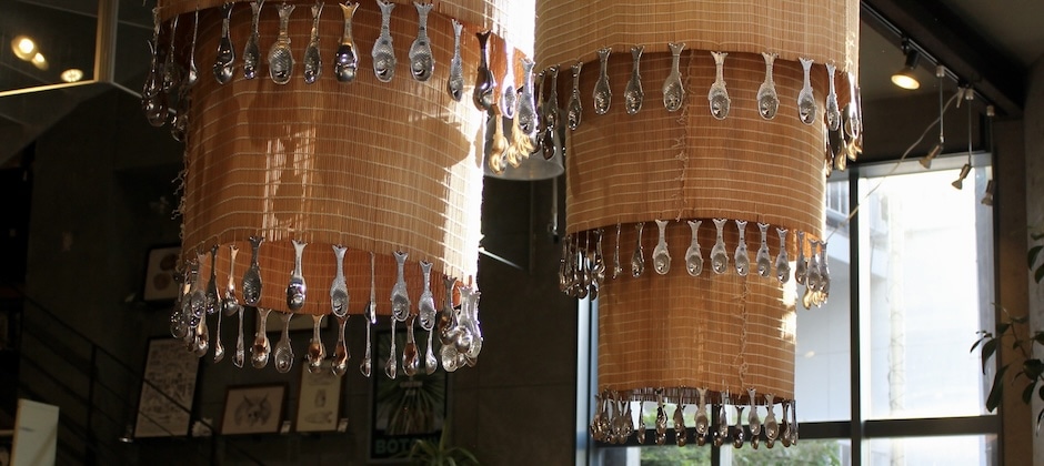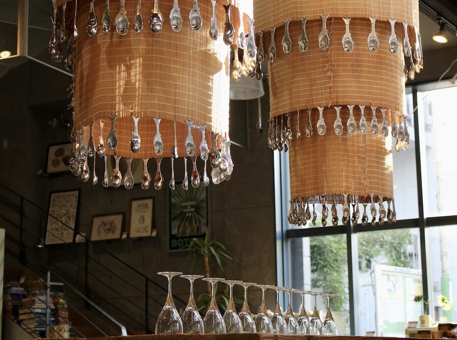FISH MEASURE SPOONを装飾に使用し、天井高約4mから吊るしたダイナミックなオブジェクト。
