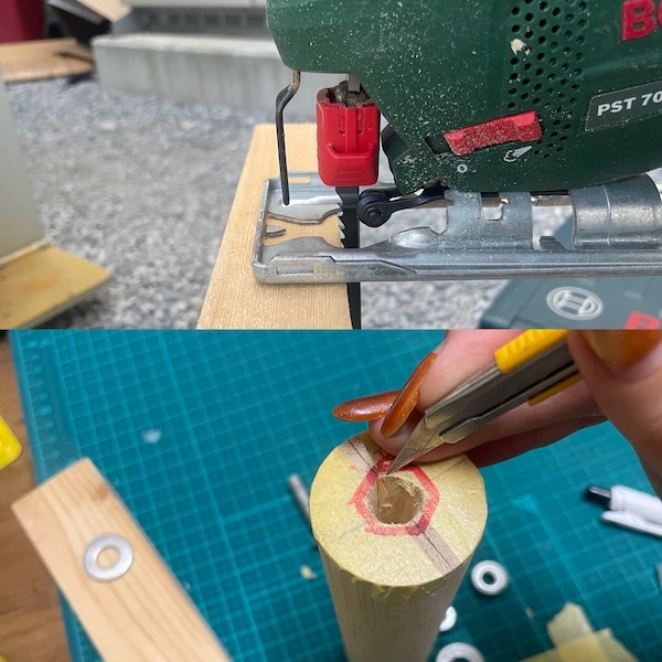テープを巻き取るためのハンドル部分は、円柱の端に六角のくぼみを掘ってボルトを固定。