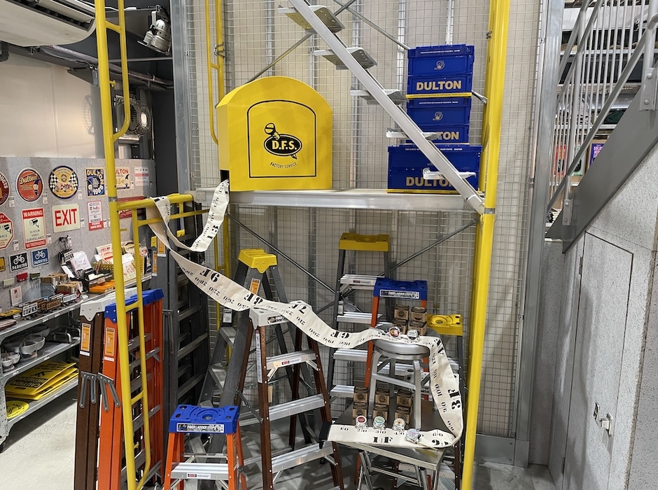 高低差のある売り場を演出するため、商品として販売している足場什器と組み合わせて設置した。