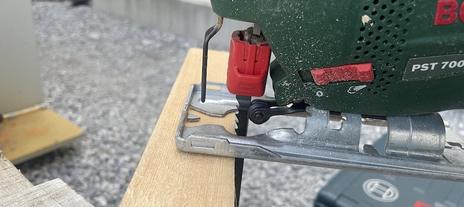 メジャー先端のつまみ部分は、外枠に引っかかるよう木材でL字に加工して取り付けた。