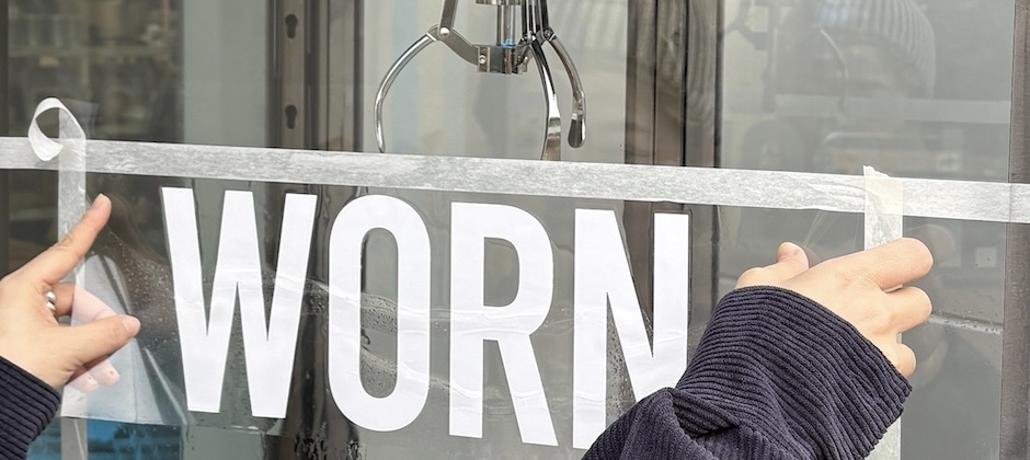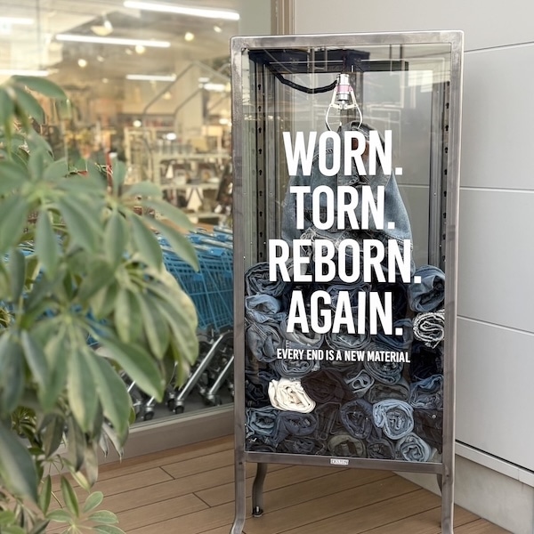 ガラス面には印象的な言葉「WORN. TORN. REBORN. AGAIN.」を。