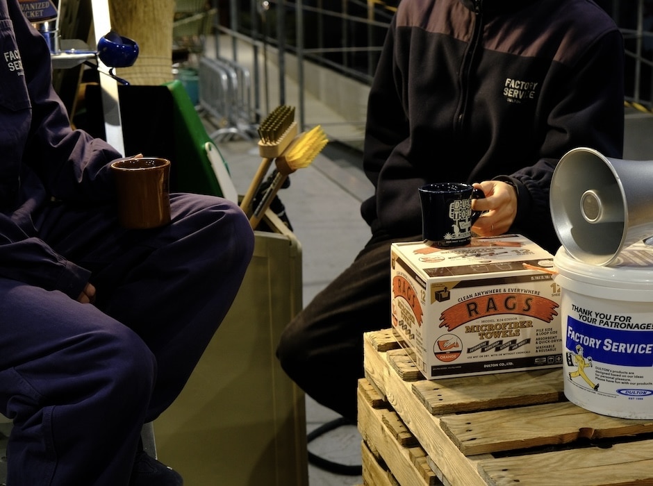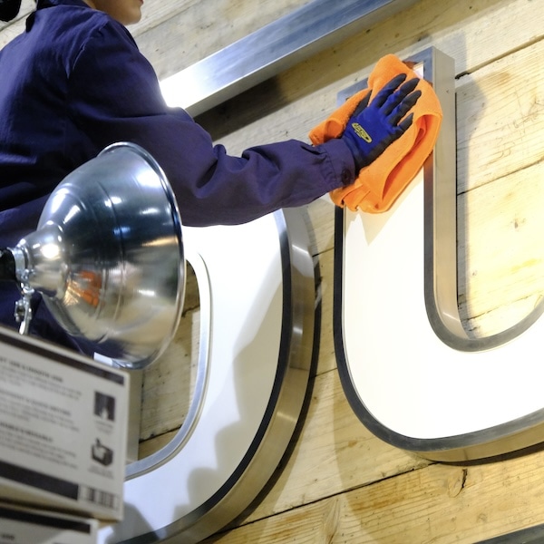 クリップランプを灯して、看板の DULTON ロゴを丁寧に拭き上げていきます。